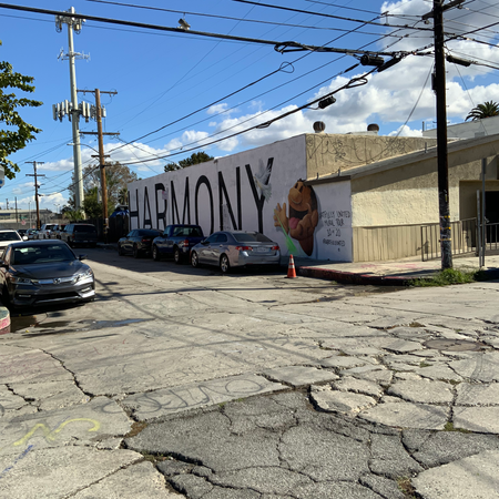HARMONY is located in the heart of the heart of Compton. It was requested by the pastor of Greater Union Baptist Church because he was disheartened to see the wall of his church covered with graffiti by local rival gangs. They stated that every time they painted over the graffiti, the wall would get written on again within the next day or so.